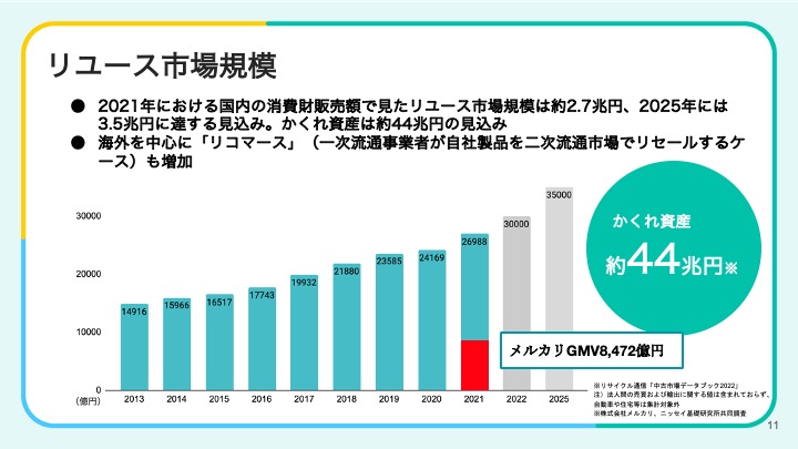 また、このセッションではメルカリから、現状認識として近年リユースの市場規模が右肩上がりで拡大しており、今後も拡大していくことが予想されることや、現在海外のハイブランドを中心に「一次流通事業者が自社の製品を市場から買い取り、そこに付加価値をつけて再び販売する」リコマースというビジネスモデルが主流になりつつあり、早晩日本でもこのような流れがでてくるであろうことを紹介しました。