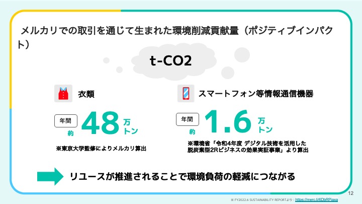 さらに、「メルカリ」を通じて衣類では年間約48万トン、スマートフォン等でも約1.6万トンのCO2排出を削減することができたことをポジティブインパクトにより示し、「メルカリ」を通して既存の製品をリユースすることは環境に優しく、環境負荷の軽減につながるということも紹介しました。